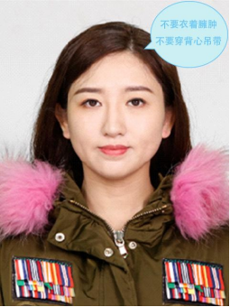 5.穿单色有领衣服,着正装,避免复杂图案、花纹,不要衣着臃肿,不要穿无袖,吊带、低胸衫、奇装异服,因图像采集背景为蓝色,禁止穿蓝色衣服;